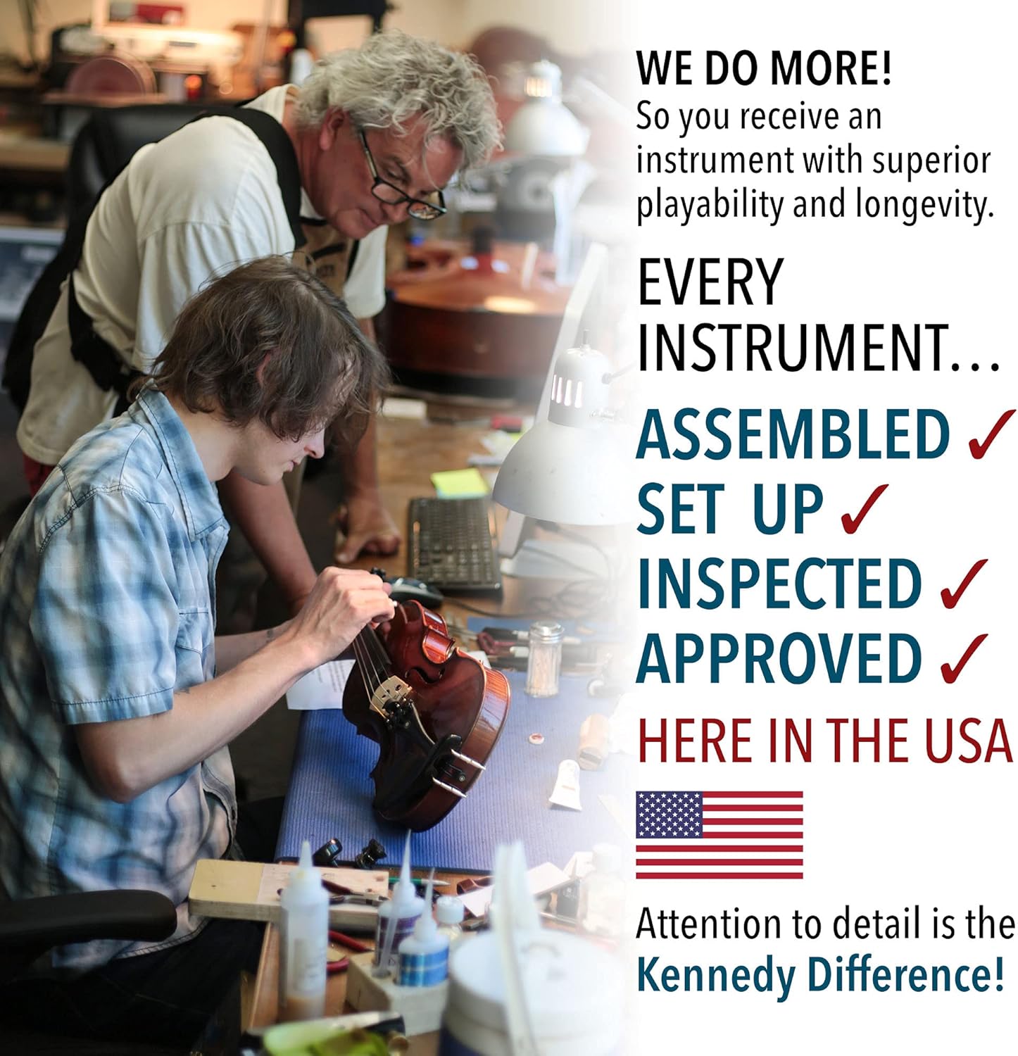 - [ASSEMBLED AND QUALITY CHECKED IN THE USA] We are different than the competitors because our final assembly and set-up are in the USA, NOT in china. Quality set-up equals LONG-TERM quality. Improper set-up can lead to poor quality sound and damage to the instrument. We send you an instrument ready to tune and start playing right away.