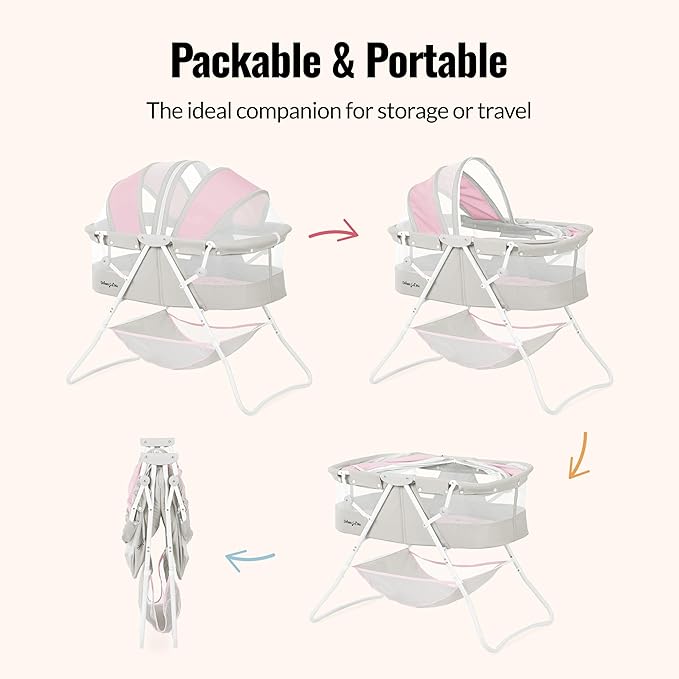 - LIGHT AND VERSATILE: The Karley Bassinet is designed with a lightweight aluminum frame that allows you to move it easily. It comes with a no-tool assembly and quick-folding mechanism. Use it indoors and carry it outdoors without any hassle