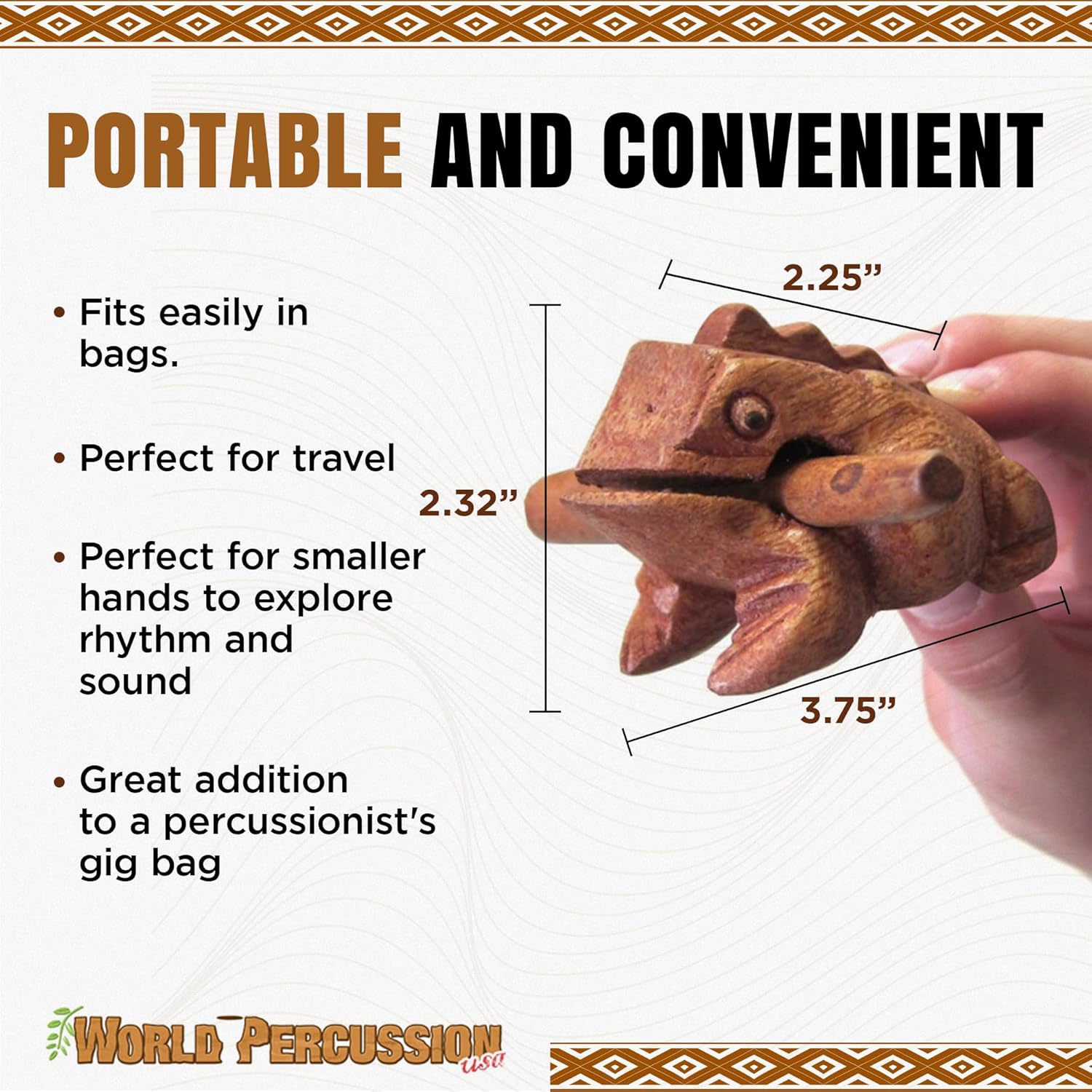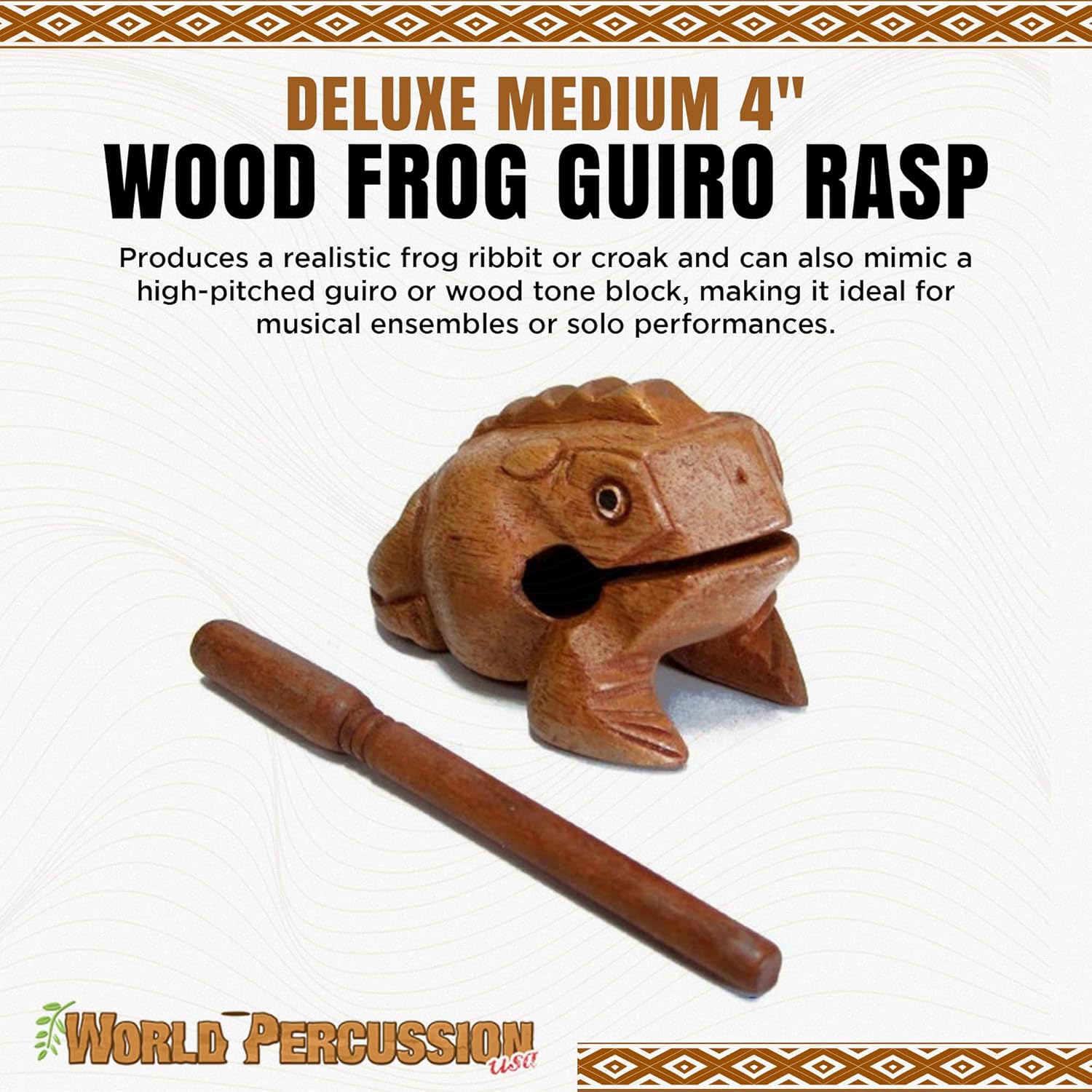 - NATURAL WOOD FINISH: Carved from a solid piece of wood, this traditional frog guiro features a natural brown wood finish that ensures durability and longevity without any paint to chip. This wooden frog instrument includes a stick for creating a variety of frog-like sounds.Sometimes the stick may fall out of the bag during handling by Amazon. If your frog is missing the stick, contact the seller directly and a new stick will be sent immediately.