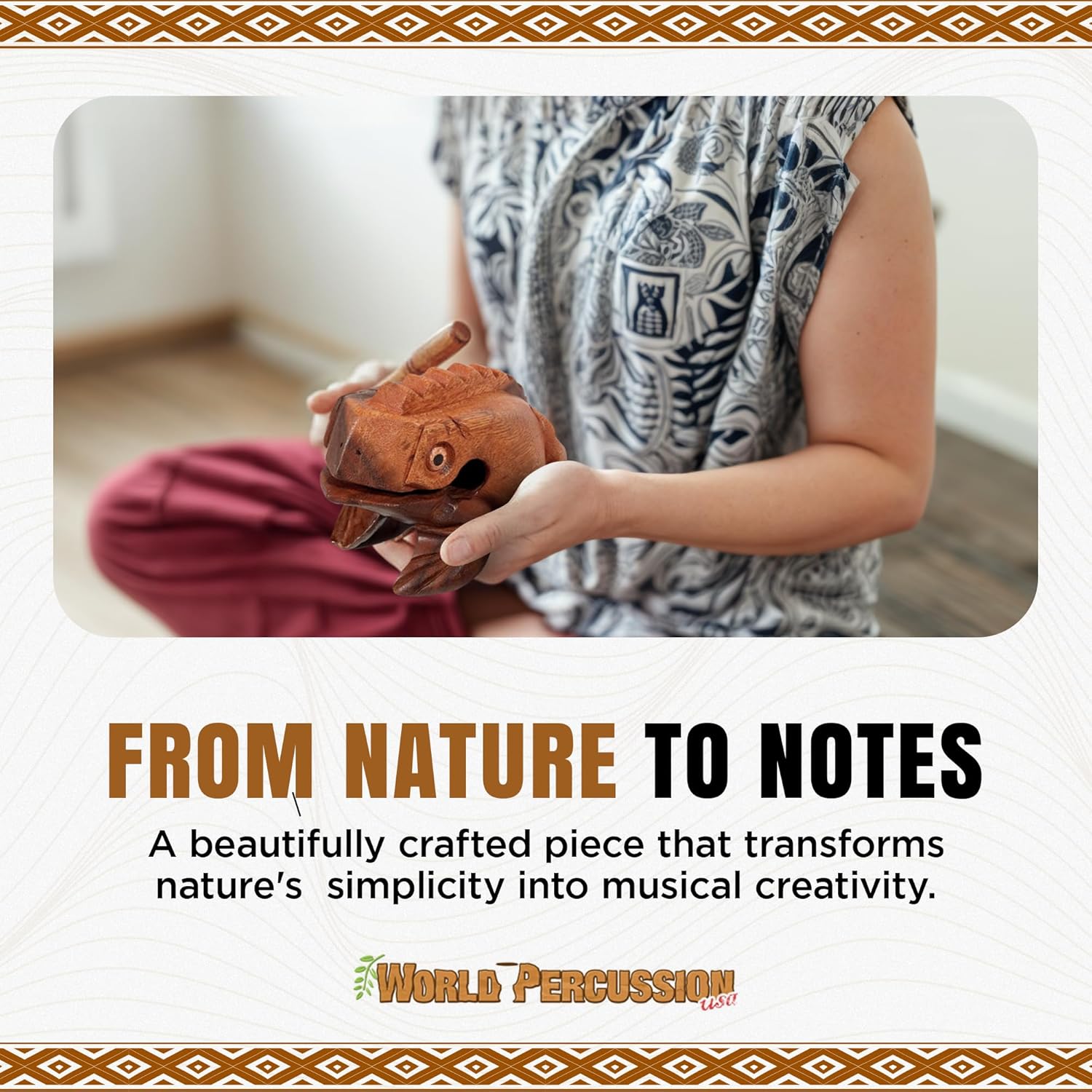 - NATURAL WOOD FINISH: Carved from a solid piece of wood, this traditional frog guiro features a natural brown wood finish that ensures durability and longevity without any paint to chip. This wooden frog instrument includes a stick for creating a variety of frog-like sounds.Sometimes the stick may fall out of the bag during handling by Amazon. If your frog is missing the stick, contact the seller directly and a new stick will be sent immediately.