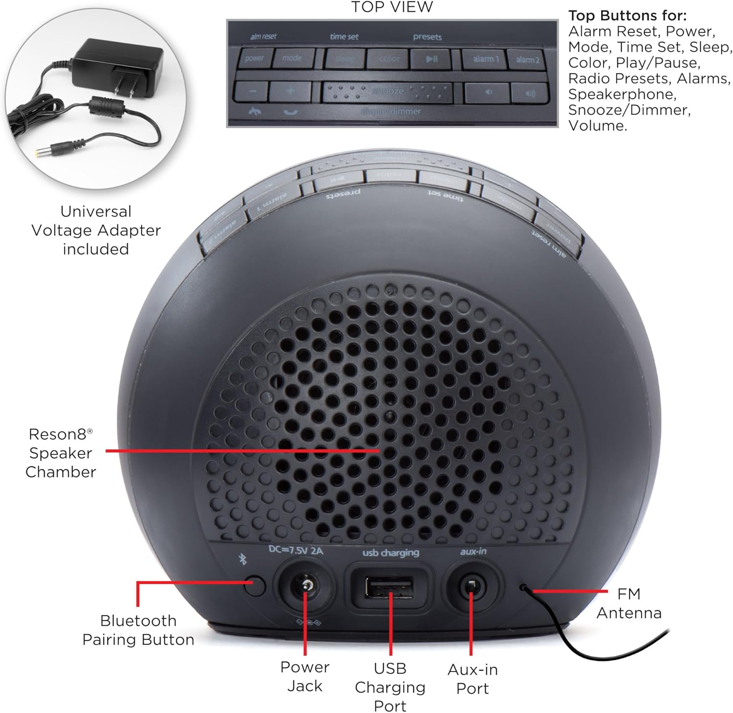 - USB Charging and Aux Jack: Power up your devices while you sleep, using the built-in 5W USB charging port located on the back of the unit. Connect audio devices equipped with 3.5mm headphone jack (audio cable included) and play audio through the built-in speaker.