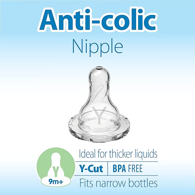 - ANTI-COLIC BABY BOTTLE WITH NIPPLE. Y-Cut Nipple, with Anti-Colic internal vent system, is clinically proven to reduce colic. Decreases spit-up, burping and gas and provides a more comfortable feeding experience for baby.