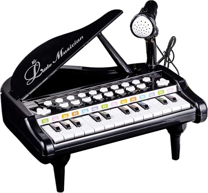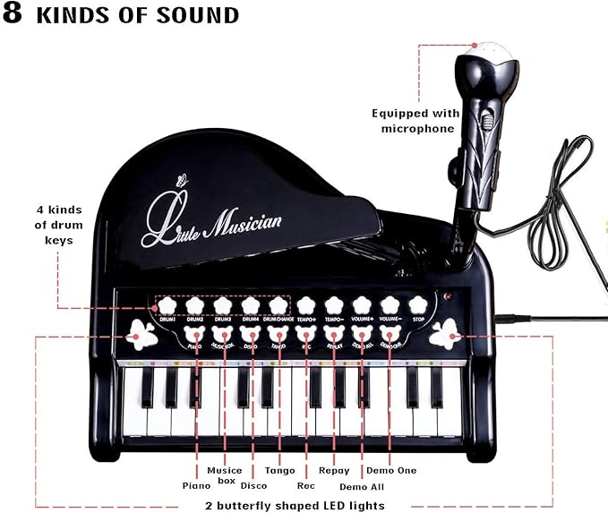 - Multi-functional Piano for Kids - 24-KEY design kids piano with microphone, includes 8 percussion instruments, 4 musical instruments, 22 demo songs, volume and rhythms control, “play & record”, LED, external MP3 and mobile phone, allow your baby to immerse in music world