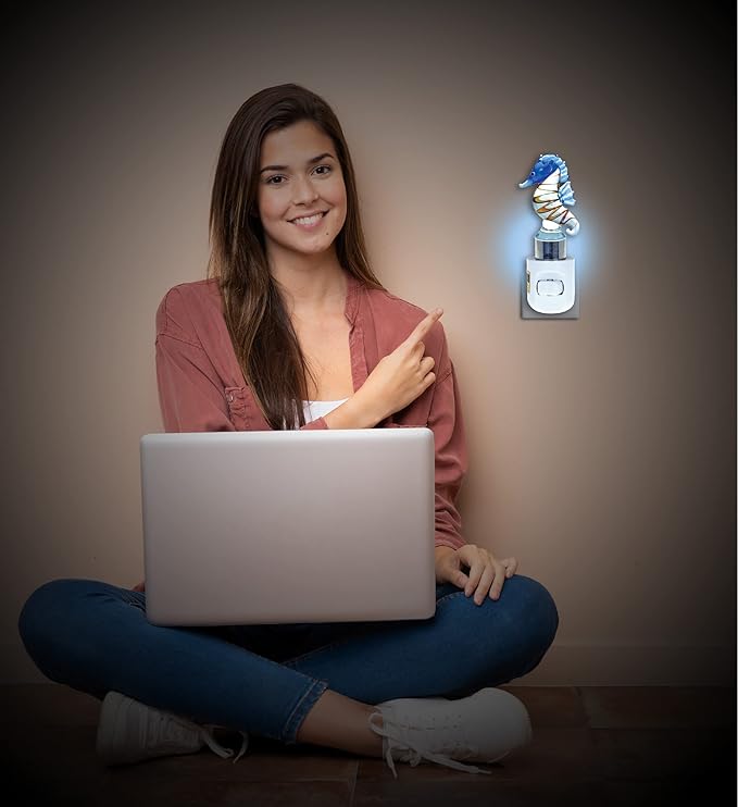 - INCLUDED WITH THE PURCHASE OF THE SEAHORSE SMALL PLUG IN LIGHT - Includes 1 Seahorse plug in night light with an easy power toggle switch on a narrow base that won't block the entire outlet. Unique night light perfect for ocean life themed home, designed in the form of a clear seahorse with blue and yellow accents. The rustic night light gives off a soft glow to help you fall a sleep. The seahorse cute night light measures 2Lx1.5Wx4.5H inches.