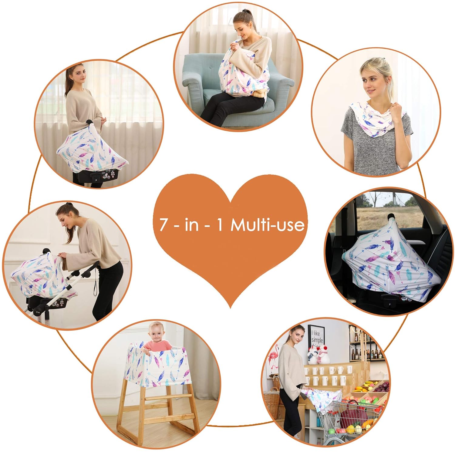 - Multi-use covers for new mothers – Car Seat Covers, breastfeeding covers, shopping cart cover, feeding chair cover.