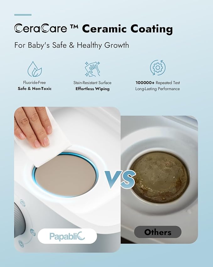 - ๐ญ๐ฌ๐ฌ% ๐ป๐ผ๐ป-๐๐ผ๐ ๐ถ๐ฐ ๐ฐ๐ผ๐ฎ๐๐ถ๐ป๐ด: The first brand to implement ceramic-coated plates in sterilizers. Our pioneer CeraCare ceramic coating is 100% non-toxic, also makes descaling limesacles and mineral build-up a breeze. One less thing to stress about for your newborn's feeding hygiene.