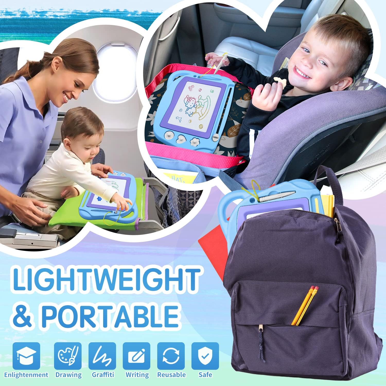 AiTuiTui Magnetic Drawing Board Mini Travel Doodle, Erasable Writing Sketch Colorful Pad Area Educational Learning Toy for Kid/Toddlers/Babies with 3 Stamps and 1 Pen (Sky Blue)