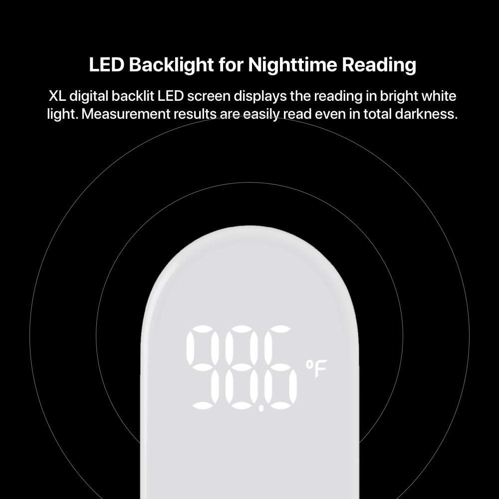 - Simple, Fast, Clear, And Quiet: With an intuitive single-button control design, the thermometer reads and shows the temperature in just one second on its easy-to-read, extra-large LED display, even in total darkness. When the temperature is read, the device gives a gentle vibration notification to the holding hand—no beeps or buzzes.