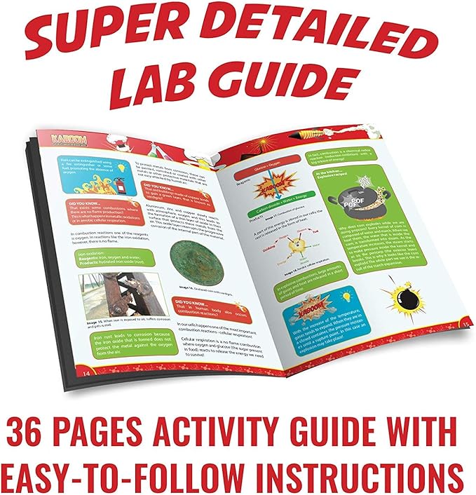 • KABOOM! The Irresistibly Fun Combustion Chemistry Kit - “CURIOUS” “HIGH ENERGY” “CREATIVE” (or bored ;) kiddo? We guarantee this becomes your kid’s favorite toy, with the ideal balance of explosive fun kids love and safety you’ll appreciate.