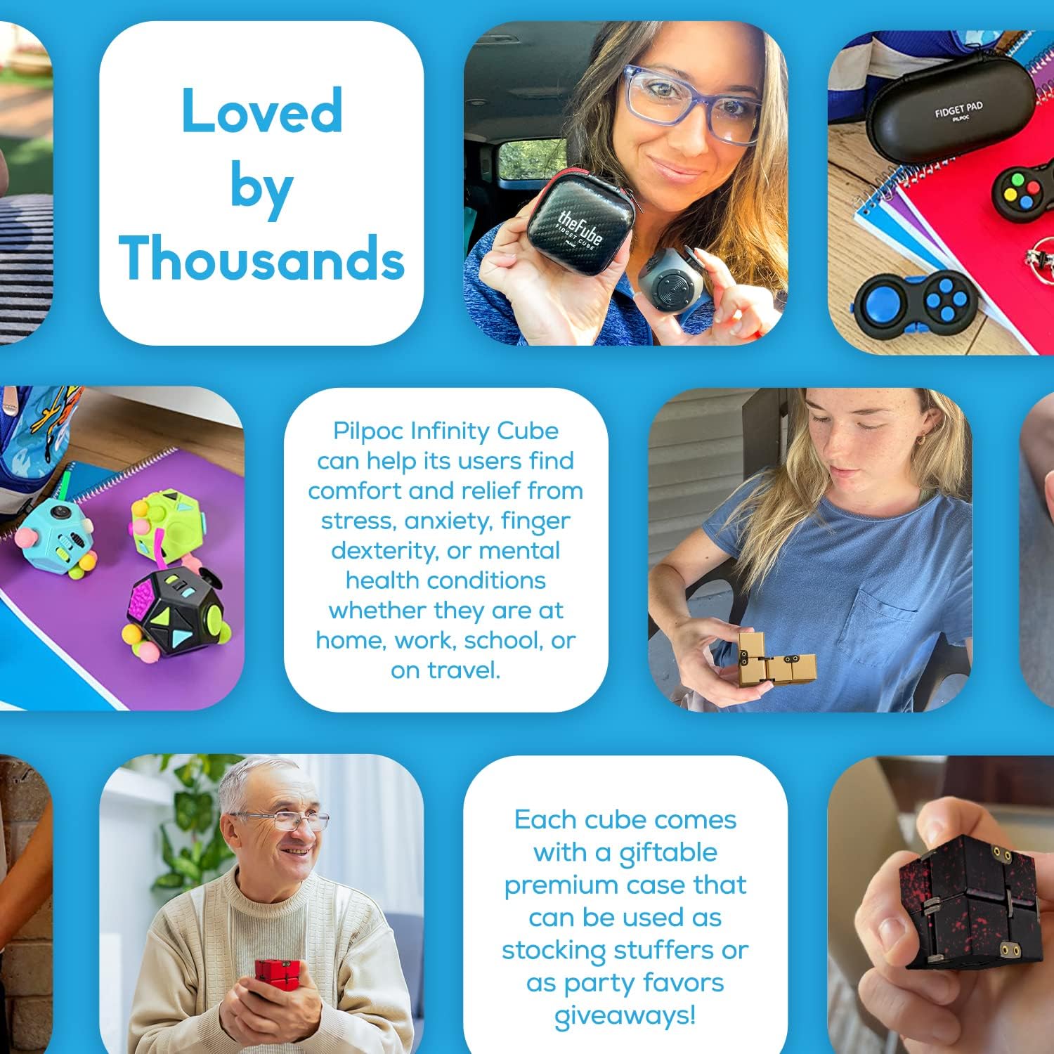 - REDUCE STRESS, ANXIETY, FOR ADHD: PILPOC theFube Infinity Cube Magic Fidget Cube desk toy has been designed to help people relieve stress and anxiety. It helps students focus, it is relaxing for people with ADHD, it helps seniors improve manual dexterity, and it even helps quitting smoking or biting the nails.