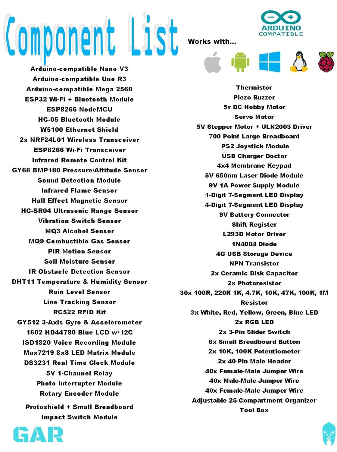 - All-in-one bundle with extra accessories + 16G USB storage with free access to the GAR Dropbox Cloud including PDF guides & links to tutorials and videos to help you learn to program all the parts and get started quickly