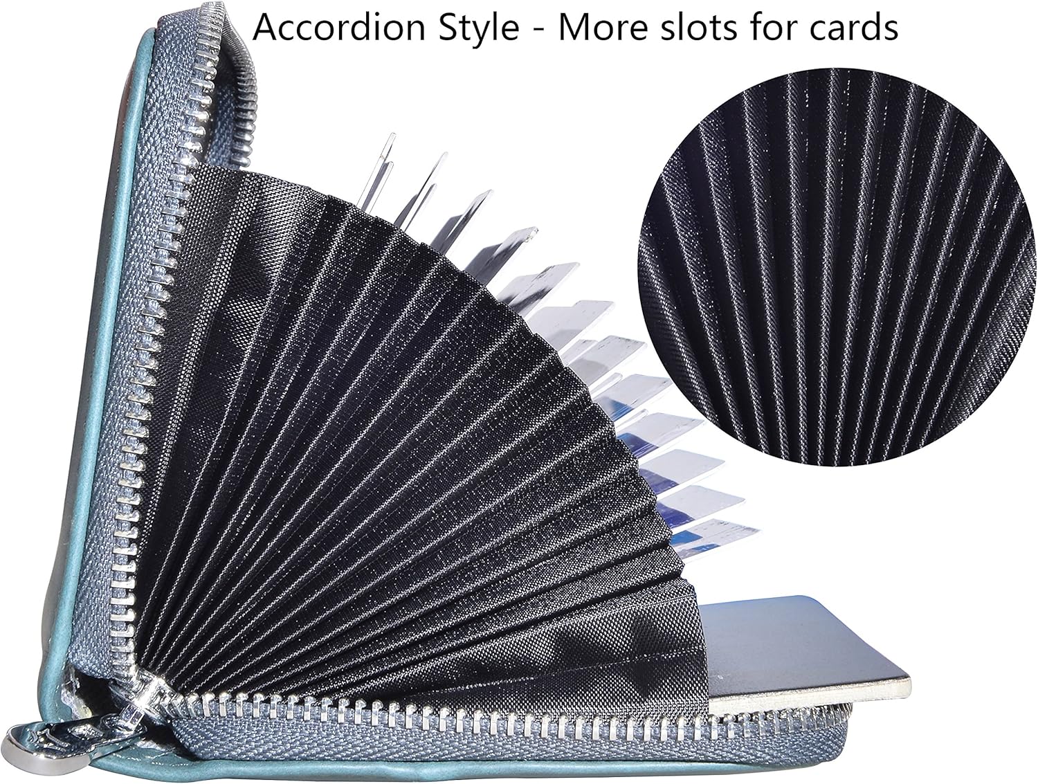 - Large Capacity: 24 accordion slots hold at least 24 cards (each slot can hold 1-2 cards Stably), give you an easy access to debit cards, credit cards, gift cards, etc. And the durable fabric lining can gurantee you a lasting use, it's size will be a little larger.