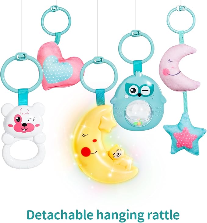 - A baby bear, a soft-to-touch heart, a cute owlet, a little star, and a funny crescent moon are detachable for tactile and gripping experiences to develop fine motor skills. These 0 to 36 months baby toys are designed to make the baby amused and entertained.