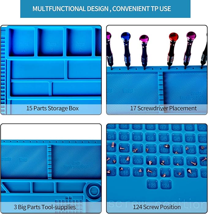 - 【Multi-Function】: Large soldering mat built-in scale ruler (0 ~38cm/0~15inches), 124 screws position and 4 pcs magnetic parts areas, 18 notches and 49 spare unit to classify precision parts, which improve your work efficiency and make maintenance platform more clean and tidy