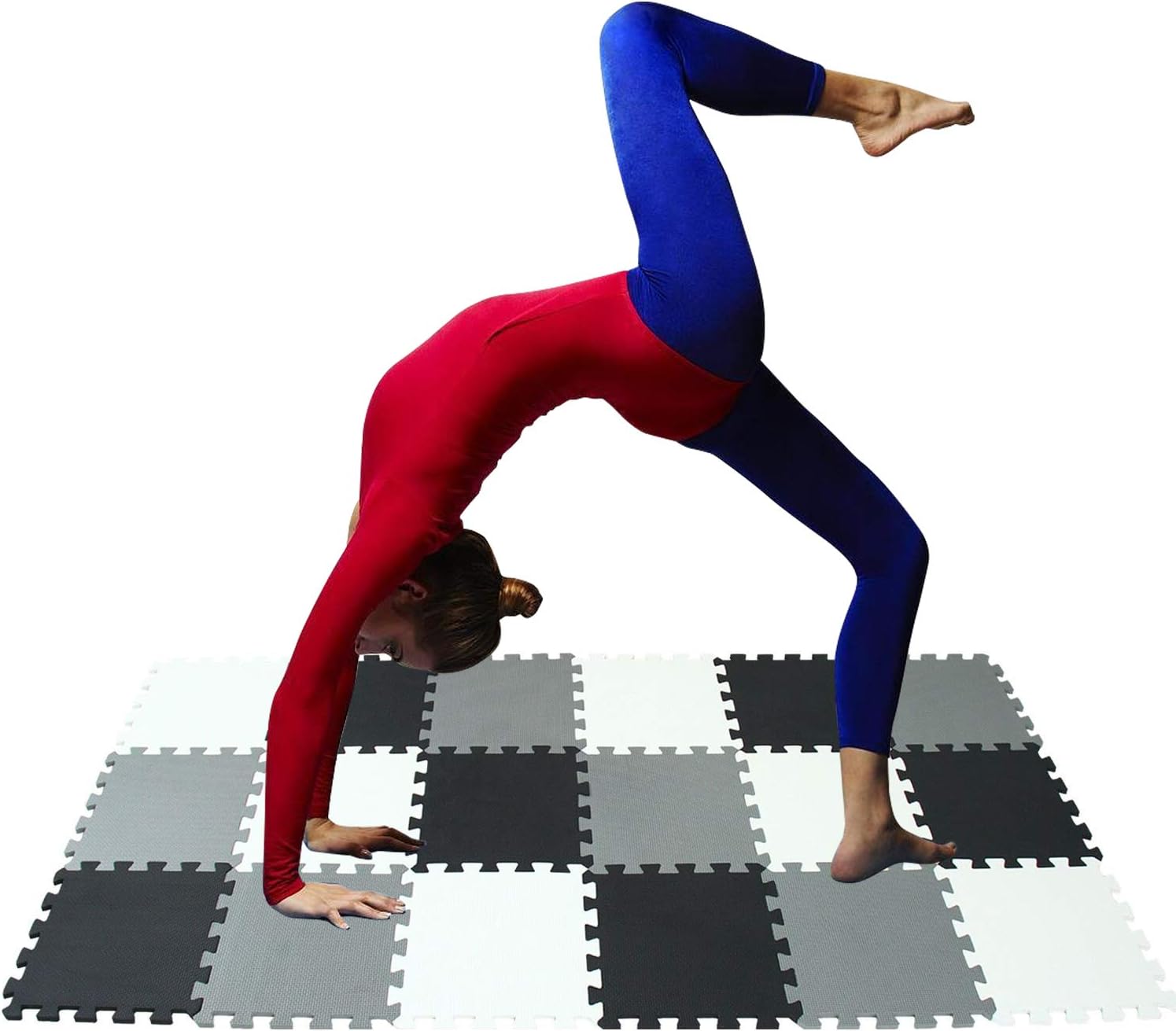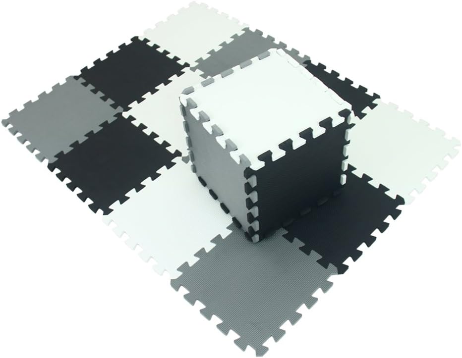 - Cover area: 86CM x 170CM( ±1CM) / approx. 1.46 SQ. M,one sets 18pcs,(300mm x 300mm x 10mm). Package includes 6 WHITE ,6 BLACK and 6 GRAY interlocking foam tiles, making it a perfect workout and training accessory.