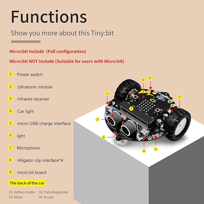 - Programmable robot car based on Micro:bit is a tiny programmable computer, designed to make learning and coding easy and fun! Tiny:bit is a robot based on micro:bit, small and portable, and most importantly, it is cheap and easy for every child.(Note: Please consider whether you need to include the Micro:bit version,Without microbit, robot cannot work)