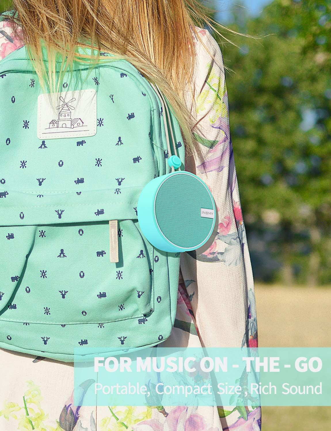 - 【MORE BASS LESS SPACE BIG SOUND】 This INSMY wireless speaker is built with an active deliver and extra passive radiator in this compact small size, delivering immersive and stereophonic audio for you from the beach to the bathroom. It's really loud, pure, musical, and dynamic. The small portable speaker impresses with a loud and clear sound performance even under showering noise.