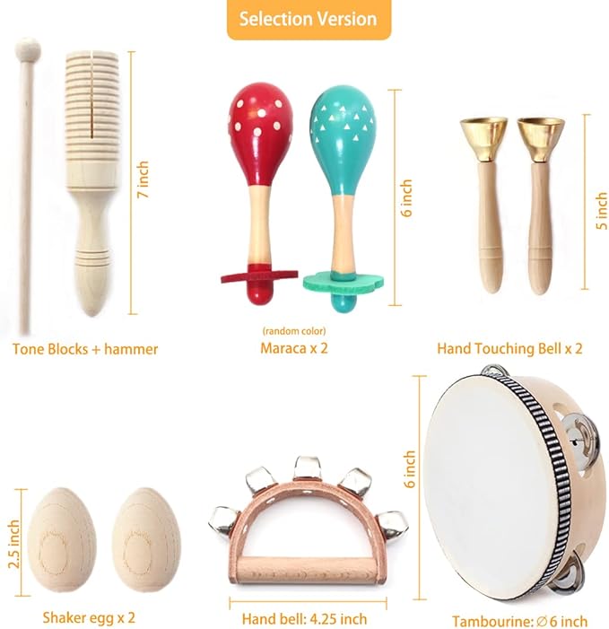 - ♬.Selection of Instruments Includes : 6 types 9 PCS musical percussion instrument and shakers ,1 tambourine, 2 shaker eggs, 1 pair of maracas, 2 touching bells, 1 hand bell, 1 tone block with hammer.