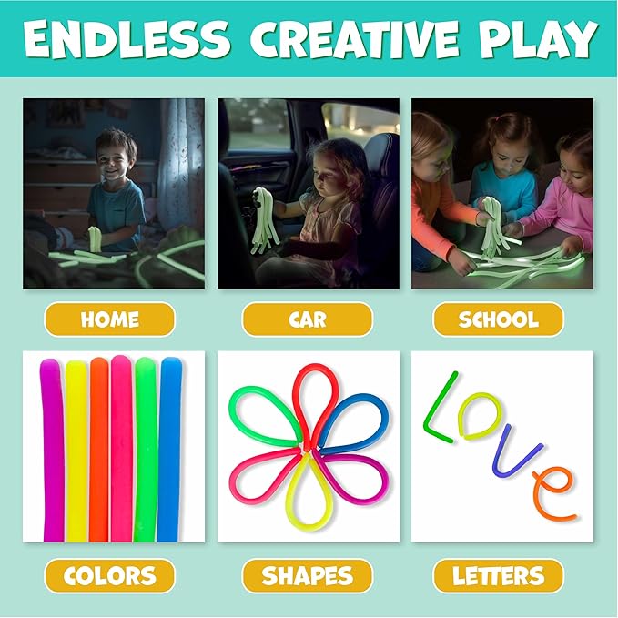 - Glow In The Dark Stretchy Strings - The ultimate sensory toys that provide fun and entertainment for both kids and adults. A great addition to any quiet time setup. The vibrant colors offer engaging visual stimulation and an incredible glow in the dark—just hold them up to a light source for 60 seconds and watch them shine!