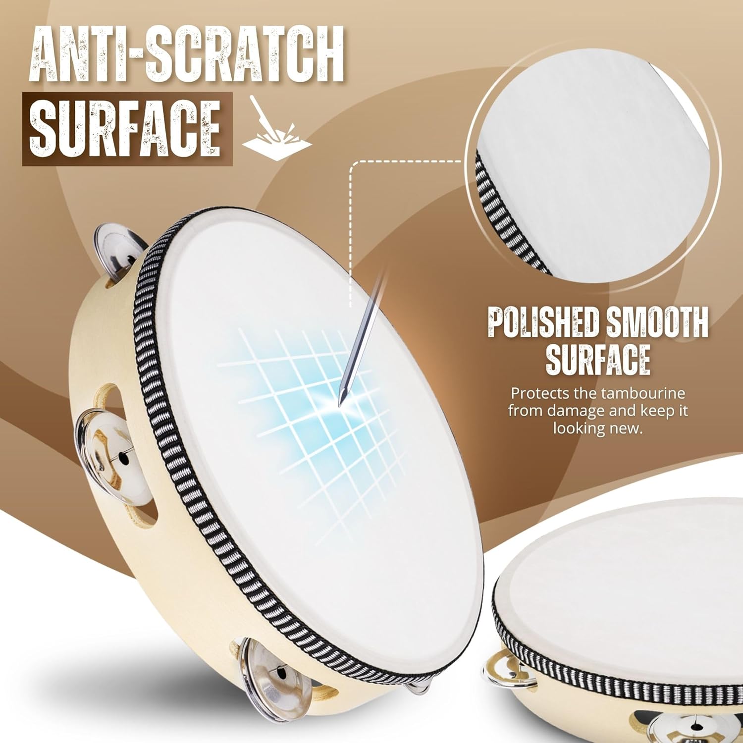 - Set of 2 large and small tambourines - 8" and 6" sizes, with a single-row 4 pairs jingle set for the 6" model, and either a single-row 5 pairs jingle set for the 8" model