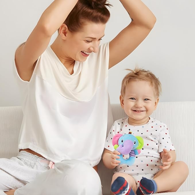 - CUTE DESIGN -- Lovely animal image design,the ears of elephant and the wing of owl were with sound paper, encourage baby to reach and grab.The Soft rattles have bells inside, it make “ling,ling...” sounds when shaking the dolls.