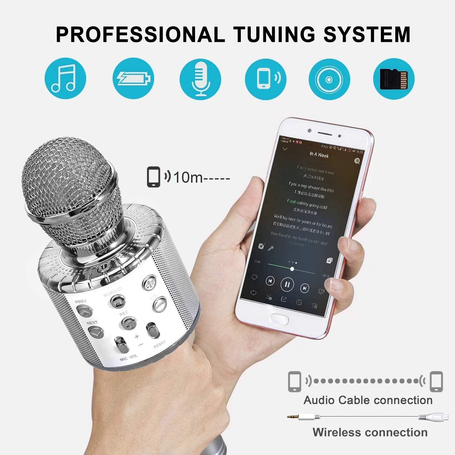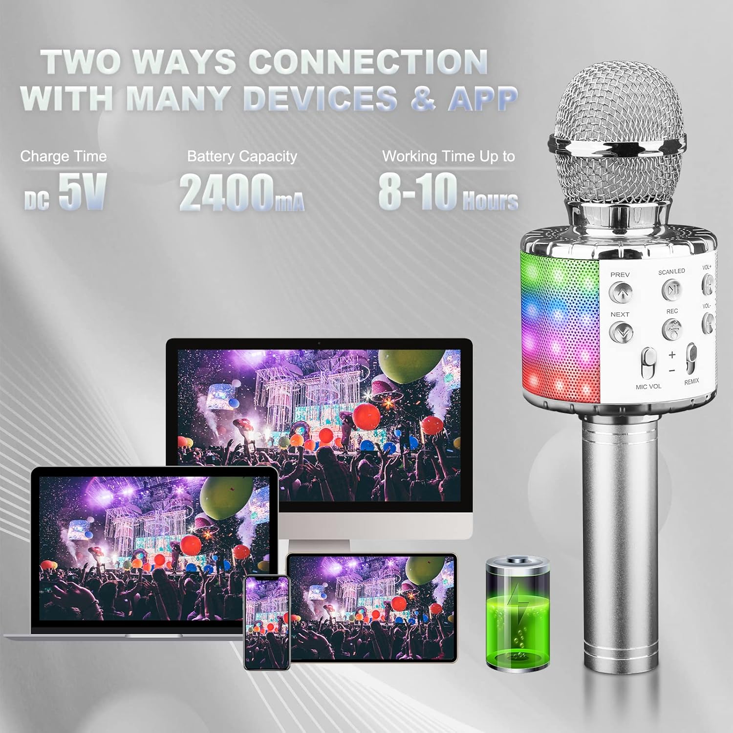BlueFire 4 in 1 Karaoke Wireless Microphone with LED Lights, Portable Microphone for Kids, Great Gifts Toys for Kids, Girls, Boys and Adults (Silver)