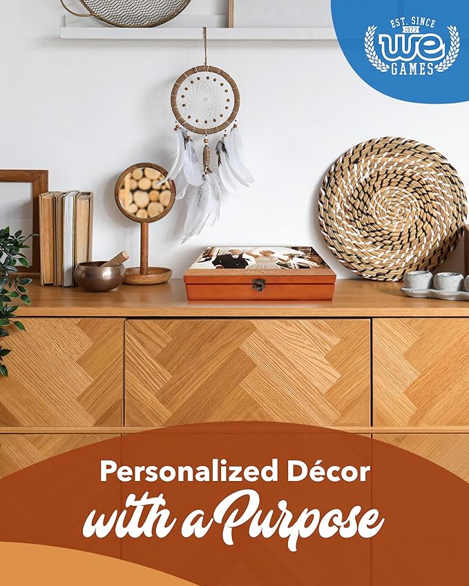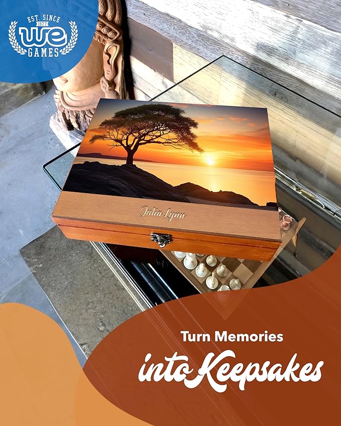 WE Games Wooden Memory Box for Keepsakes – Vintage Decorative Storage Box with Lid - Light Cherry Finish with Image Color Print