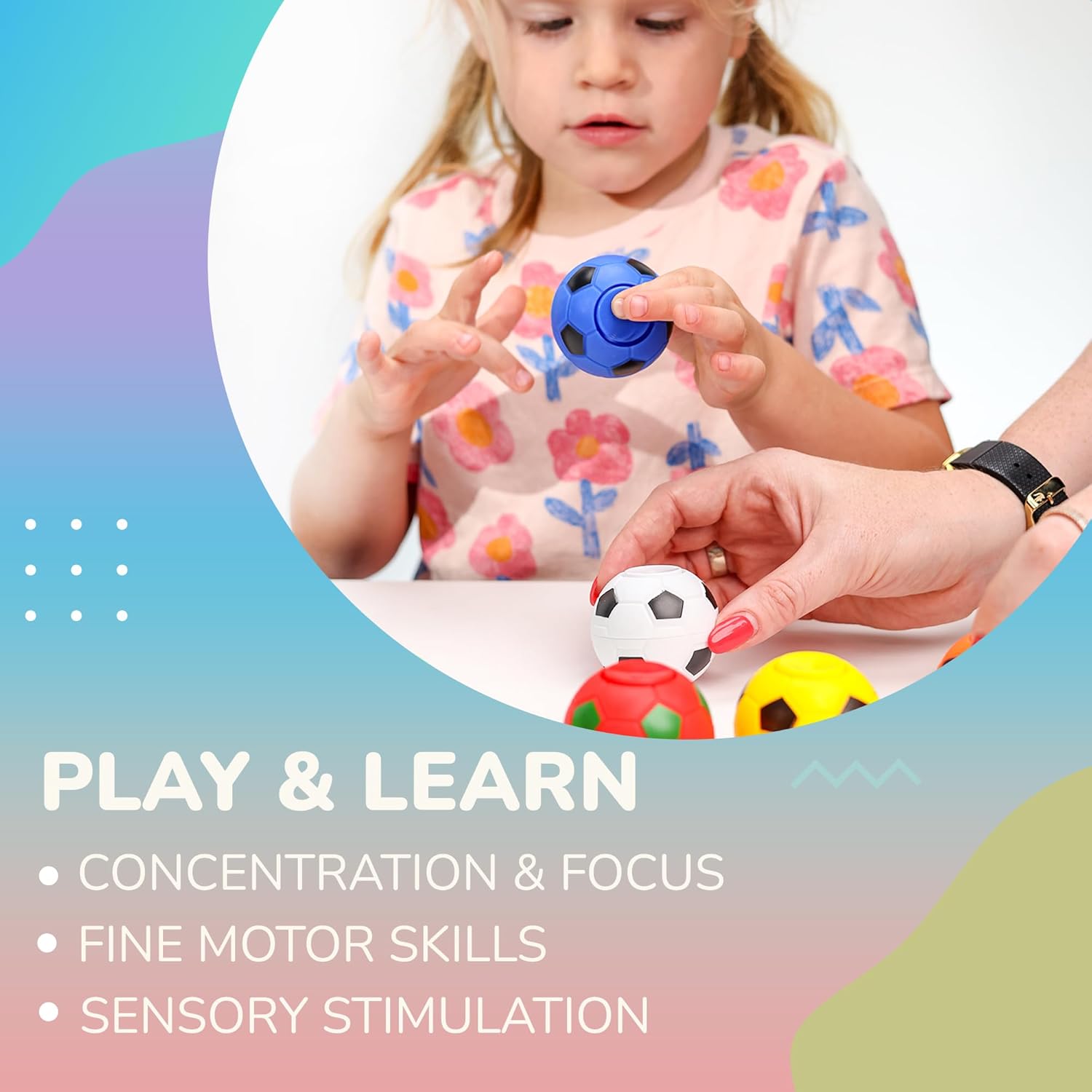 - COLORS: assorted colors fidget balls of classic Soccer Balls patterns; eyes catching patterns on these spinner toys surface help focus and calm; you get 50 pcs fidget spinner per Order