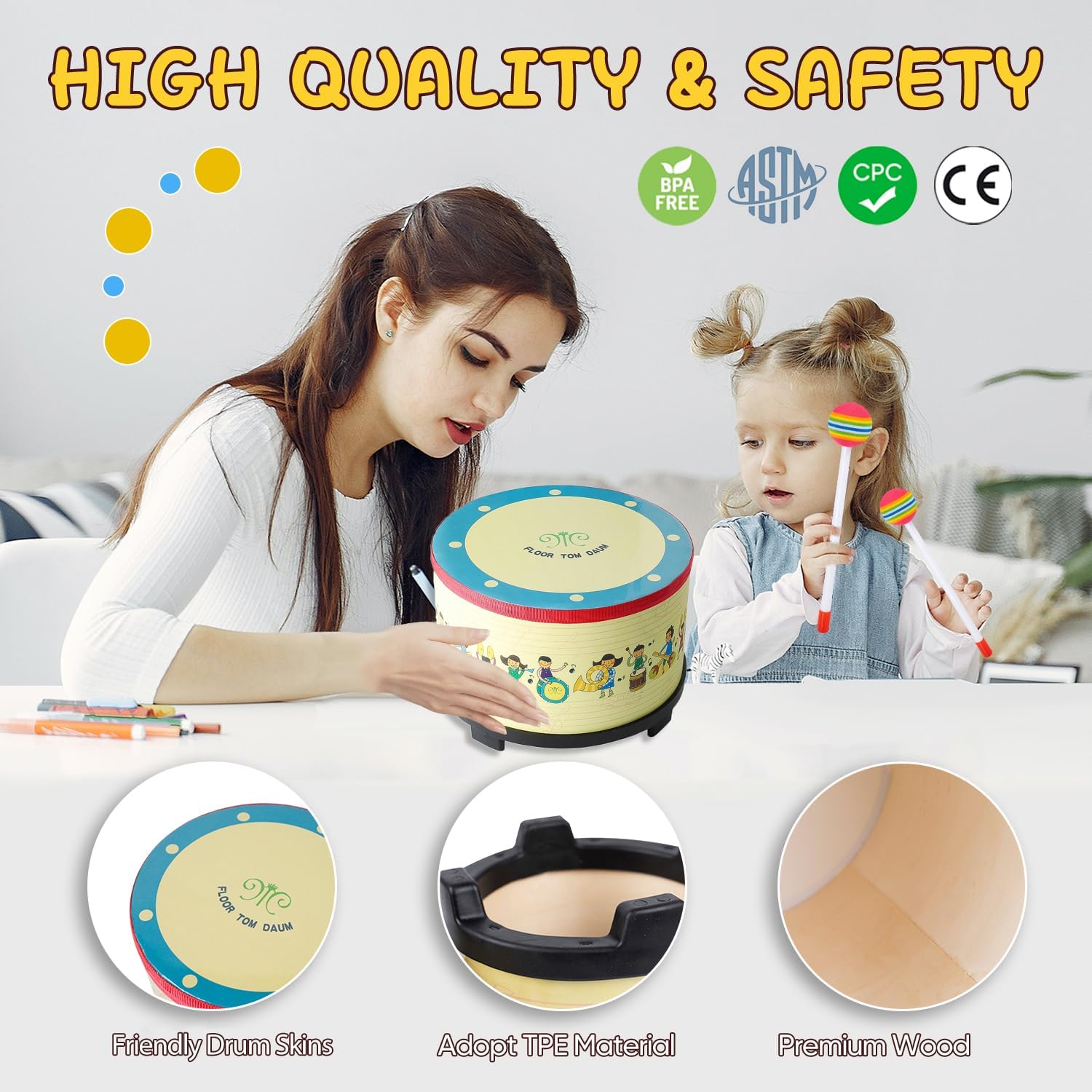 - High Quality Drum Body, Non-Slip Base: Floor tom drum is made of natural solid wood, and the head drum skin is made of durable material to avoid wear and tear; The gathering drum is designed with a non-slip base, and the non-slip feet at the bottom can be firmly placed on the ground or table. It is soft and safe toddler drum set