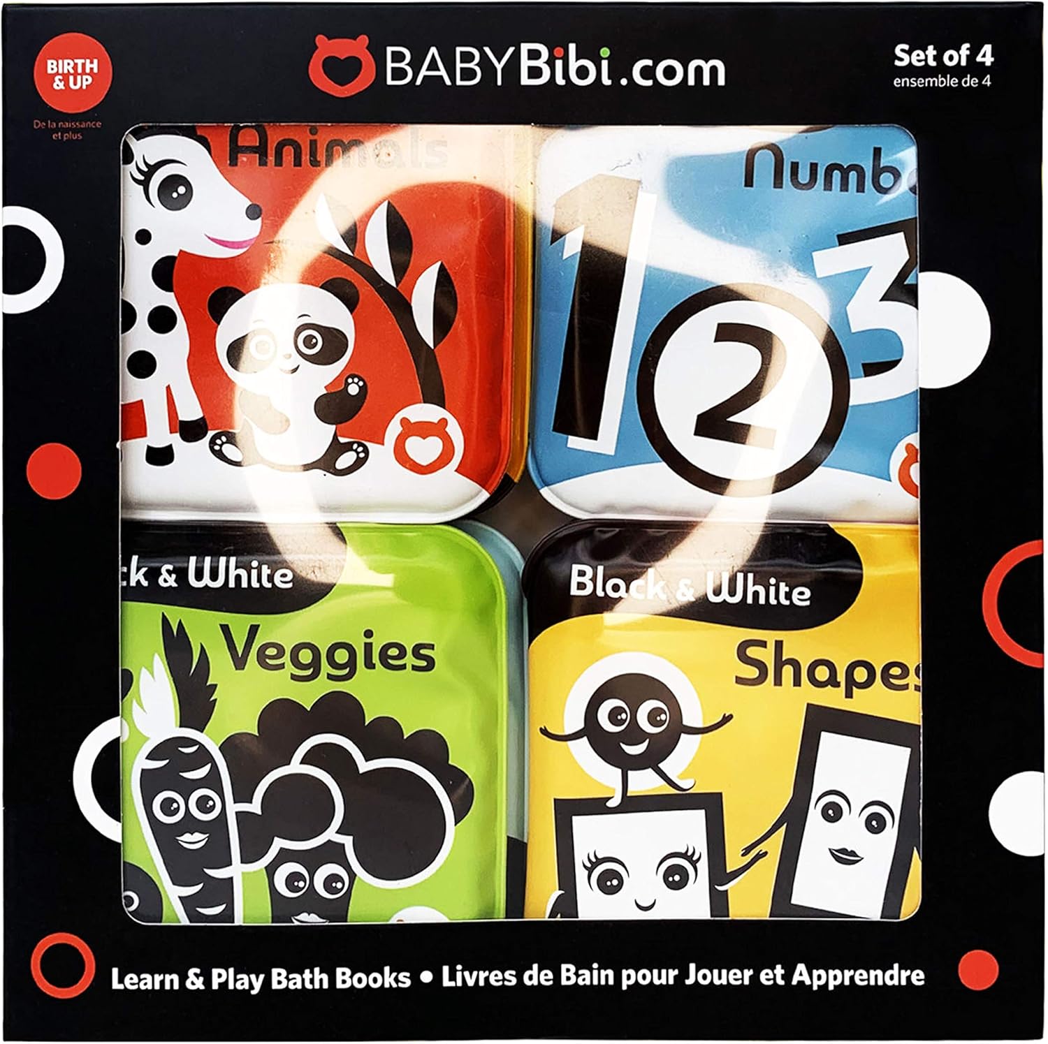 - Set Of 4 Baby Books – Each package contains 4 different bath books. The books in this package are designed to transition from baby through toddlerhood. Babies will love studying the pictures while toddlers will learn as they explore. The four themes in this package are: veggies, numbers, shapes and animals.