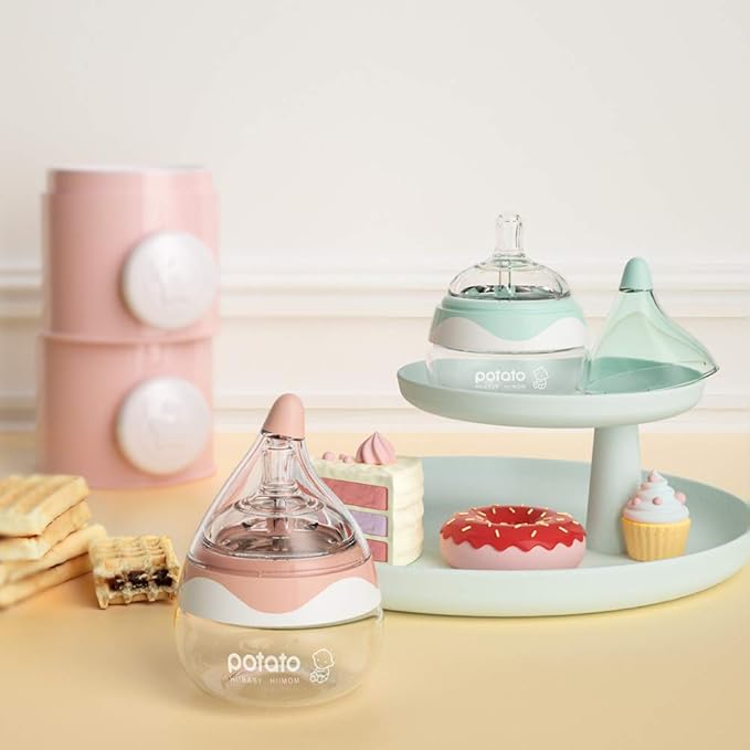 POTATO Glass Baby Bottles for Newborn Babies, Anti Colic Breastfeeding Bottle with Wide Neck, Slow Flow, 2pack, 2.5oz, Green