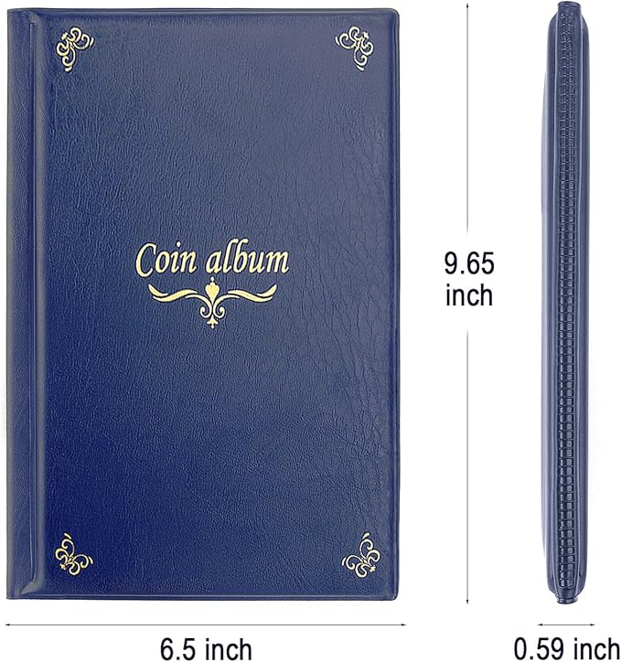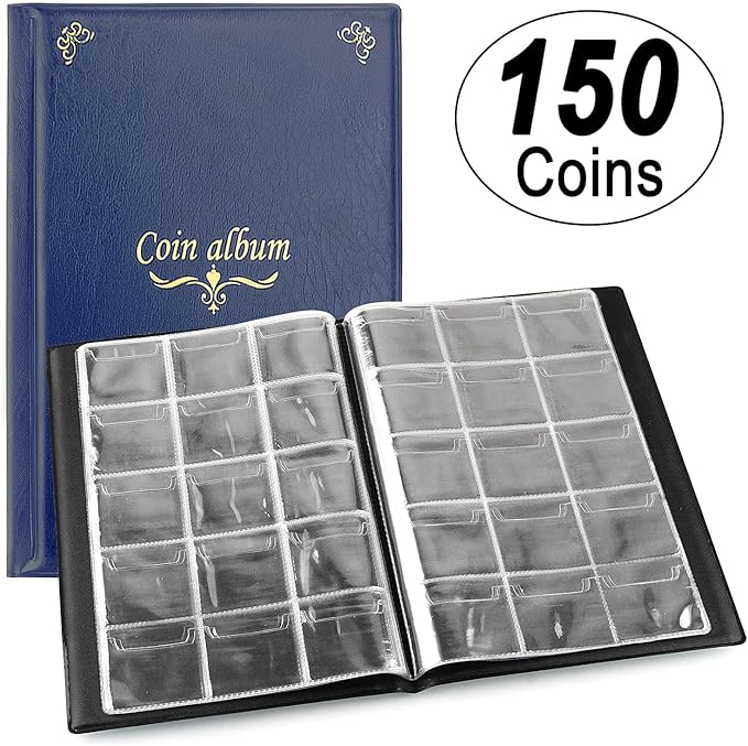 - 150 COINS COLLECTING ALBUM - Size (L x W x T) 6.5 x 9.65 x 0.59 inch, large capacity 10 pages 150 pockets coin collection book is made of artificial leather cover with clear PVC pages