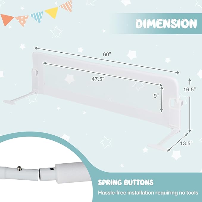 - Protect Your Baby's Safety: These 2 pack extra-long bed rails are 59 inches long each for added safety. Also When your kids sleep alone at night, they can provide them with the best protection and safe sleeping environment. They are your kid's safety guard, so you don't have to worry about your baby falling off the bed.