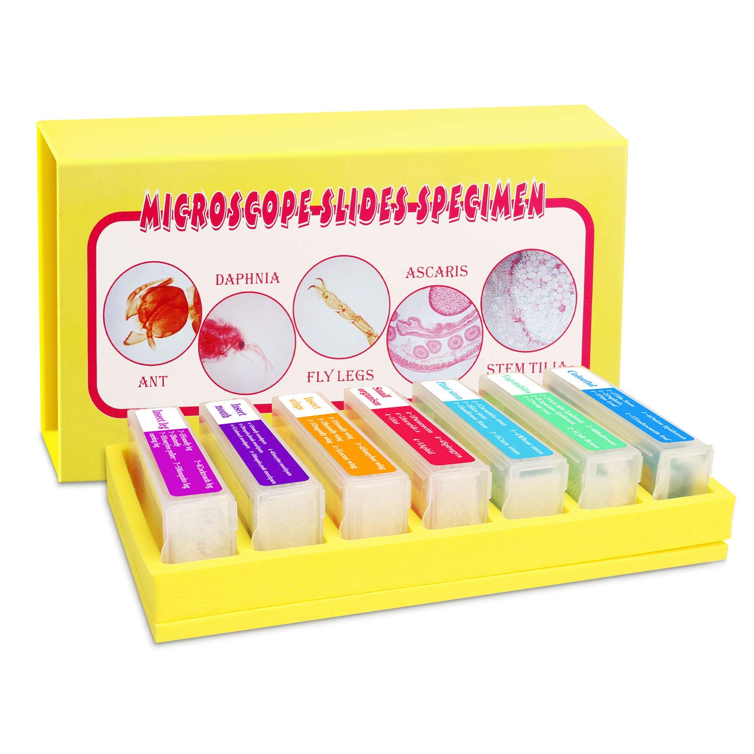 - Various Contents with Labels: 7 types microscope slides set including vegetables, colorful, plant stem, small organism, insect wings, insect mouth, insect leg in 1 box, meets almost all requirements of different kinds of biological experiments.