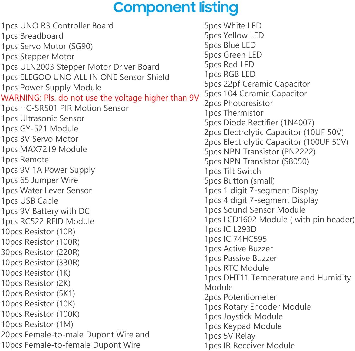 - 【Changes for Hardwares】We developed an in-line expansion version that can be applied to most of the modules in the kit: ELEGOO UNO ALL IN ONE Sensor Shield, which can simplify wiring and avoid mistakes. Also, 10 more female to female wires and some other small parts are added as well.