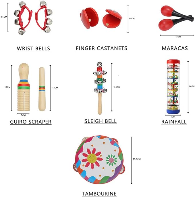 - Musical Instruments Toys Set: Percussion instruments set comes with 8 types 12 pcs colorful instruments: Wrist Bells, Finger Castanets, Maracas, Rainmaker, Tambourine, Guiro Scraper, Sleigh Bell and Storage bag