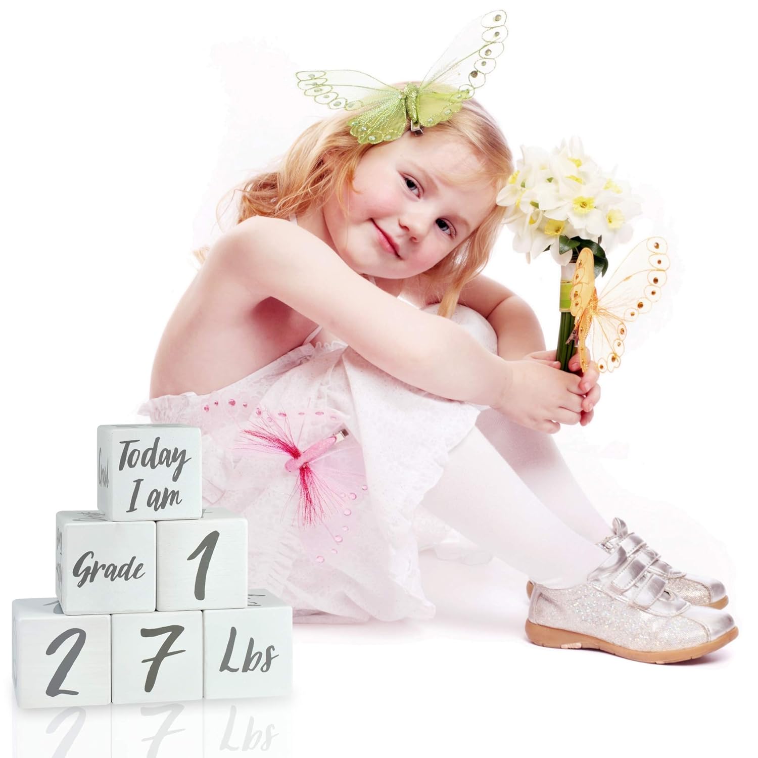 - A set of 6 solid wood printed with large numbers 0-9, 8 significant milestones, 5 popular holidays, 7 growth measurement classifiers; Days, Weeks, Months, Years, Lbs, Inches, Grade, and emoji lovely graphics. Includes cute sayings; Today I am 8 Months, My first Smile, My first Christmas, and more. Possible to make number combinations of age range from birth to adult. Awesome for weekly pregnancy countdown or tracking baby's important milestone. Each cube is 2.4 x 2.4 x 2.4 inches.