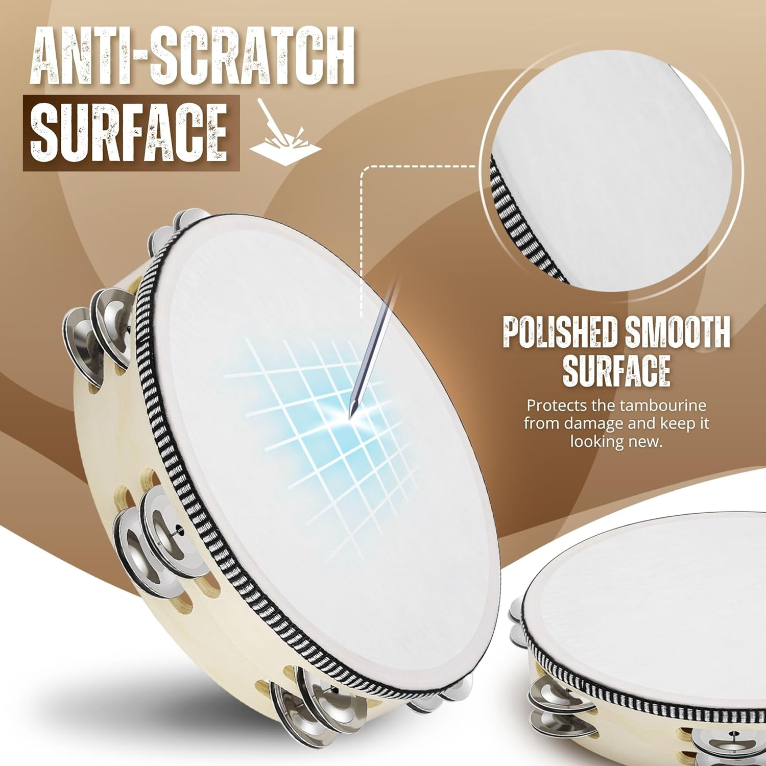 Flexzion Wood Handheld Tambourine for Kids (2 Pack) 8 Inch Double Row 12 Pair Jingles, Hand Held Percussion Drum Moon Musical Instrument with Metal Bell