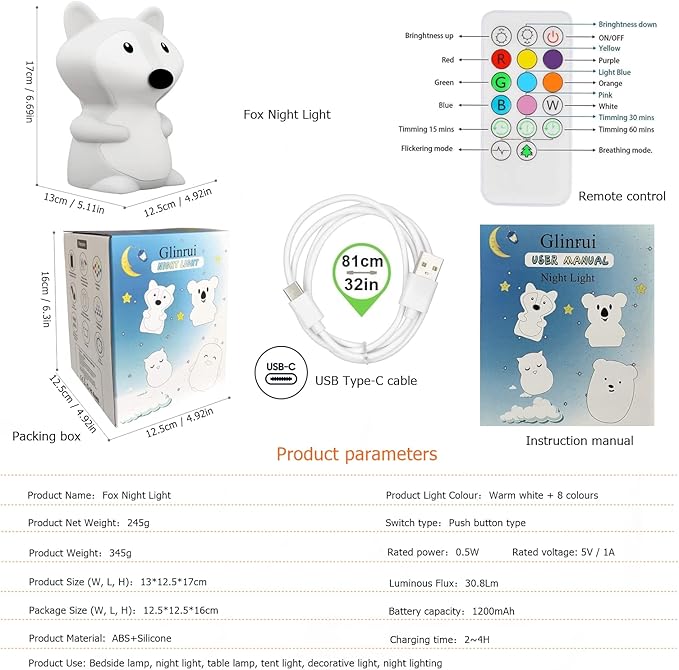 - ☀【Large size safety light】: The size of this fox night light is about 4.92*5.11*6.69 inches, which is larger than the general animal shape night light. The Glinrui squeezable night light has a comfortable and soft touch. It has no sharp edges, no glare, no heat, it can be safely placed on the bed and table, it is perfect for night lighting for babies and toddlers, boys, girls, students, women, the elderly.