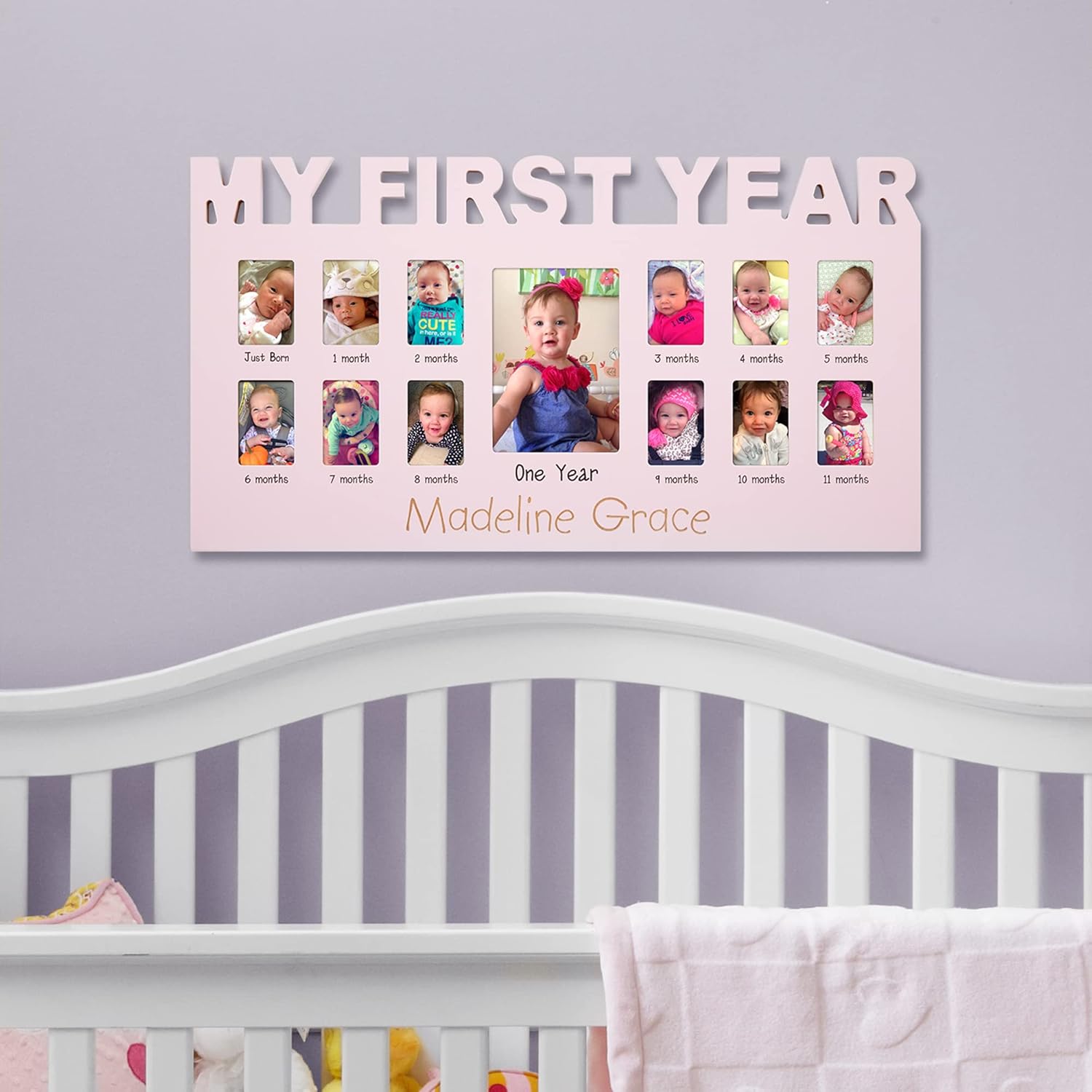 - FIRST YEAR MEMORIES: Track baby's first year growth! This charming frame has a place for the baby's newborn photo and photos for every month up to their first birthday.