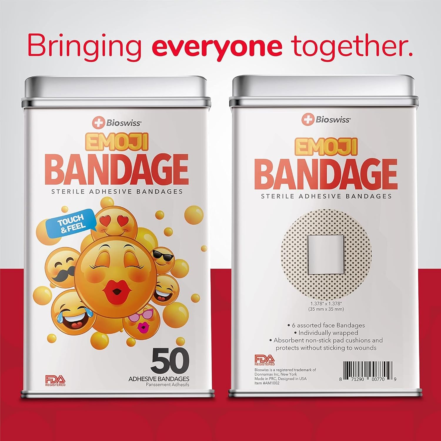 - EMOJI BANDAGES: This 50 piece tin of funny emoji bandages is great for putting a smile on kids' faces while protecting wounds such as cuts, scrapes, and burns, and come in 6 assorted emoji styles; sticky bandages are perfect for kids and adults alike, and also for school nurses and pediatric doctors
