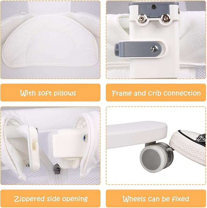 - 【Metal Frame and 6 Wheels】 The metal frame is stable and sturdy to keep baby safe. Design of 6 wheels not only makes this newborn bedside crib easy to move around the house, but also ensures stability when moving. Each wheel can be adjusted to a fixed mode, just use your foot to gently press the switch on the wheel to fix it.