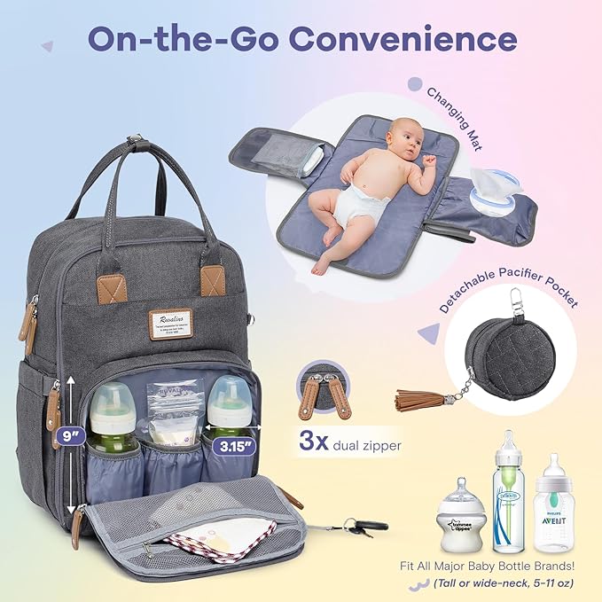- On-the-Go Convenience - Extra-wide opening and easy-glide dual zippers allow for quick, one-handed accessibility. Built-in stroller straps effortlessly attach your baby diaper bag to any stroller. And a portable changing pad holds everything moms & dads need to keep baby clean, dry and happy, as well as a detachable pacifier holder for organizing baby pacifiers or other necessities