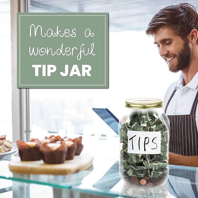 - Slotted Metal Lid – Gold screw-on lid with a pre-cut slot for easy depositing of coins, folded bills, or raffle tickets.