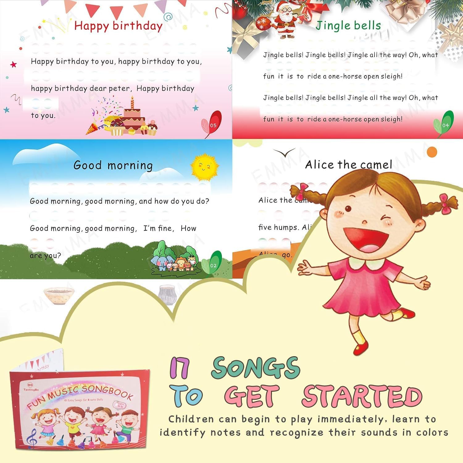 - ♪PREMIUM PACKAGE SET & BONUS 17 MUSIC SONGS - Set of 8 Colourful Hand Bells and a Songbook included 17 popular songs. We have included "Jingle Bell"and “Happy Birthday” in our songbook which are great fun for toddles to start with their musical journey.