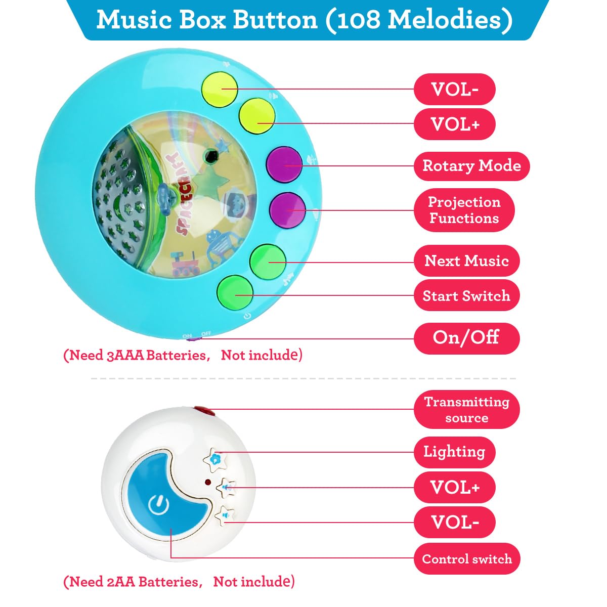 - Music Function and Star Projector Function: The night light projector can project light onto the wall and play 108 different songs. So that the baby can see the beautiful starry sky and enjoy wonderful music. Automatically switch between 3 colors of starry sky to improve your sweetie's sleeping environment