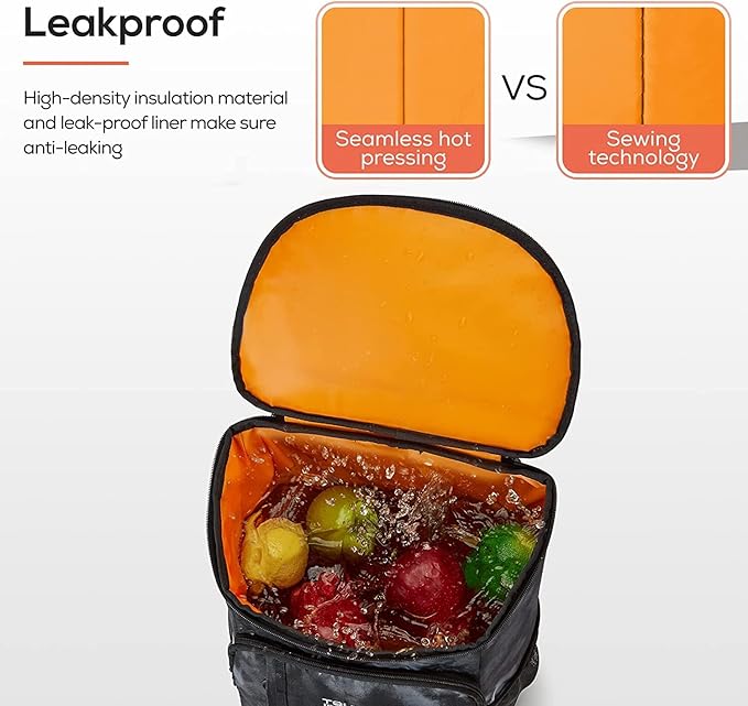 - Leakproof Cooler Backpack: High-density Insulation material and leak-proof liner inside the insulated backpacks work together to ensure anti-leaking and keep food hot / cold for 16 hours with ice packs