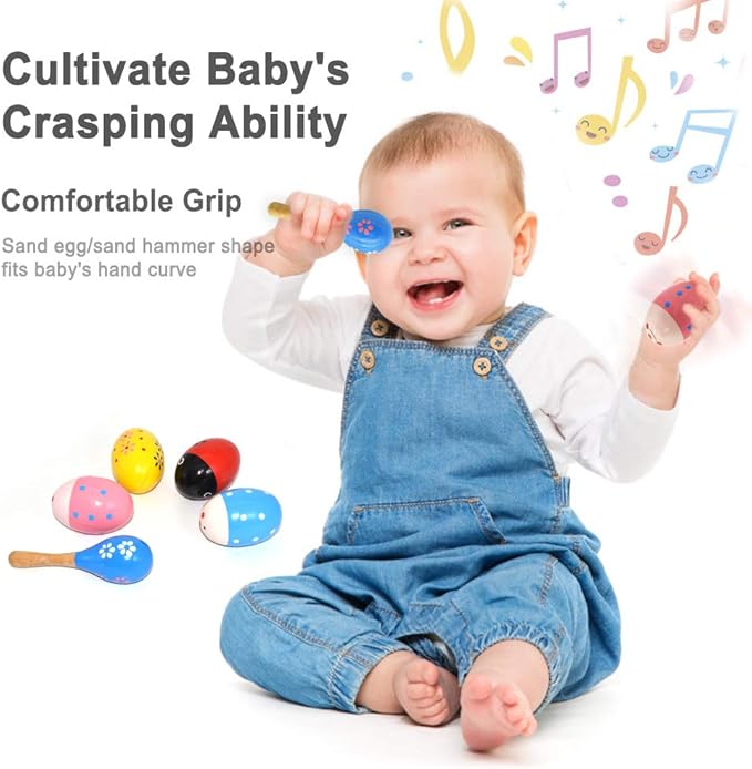 - CUTE DESIGN - The maracas egg shakers with 6 Interesting patterns and bright colors, looks cute and attractive, to meet kids preferences. Shaking bring pleasant sound will much fun to children. It is super cute wooden shaker toys and kids musical instruments