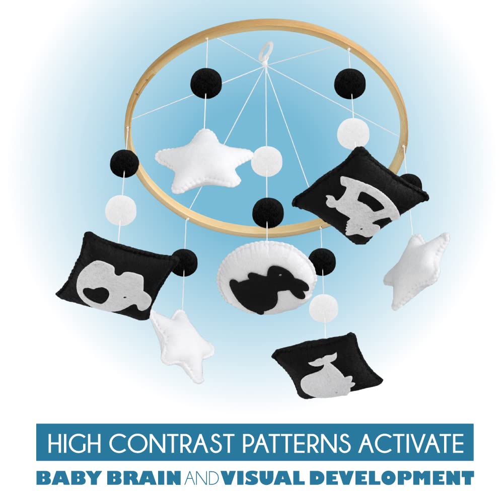 - 🌱 VISUAL STIMULATION FOR BABY 0-5 MONTHS - Introduces baby to high contrast images and colors for early visual development with a hanging mobile over little one's crib. The baby crib toys that attach to the crib are high contrast baby toys with 5 different shapes which give visual stimulation to engage your baby.