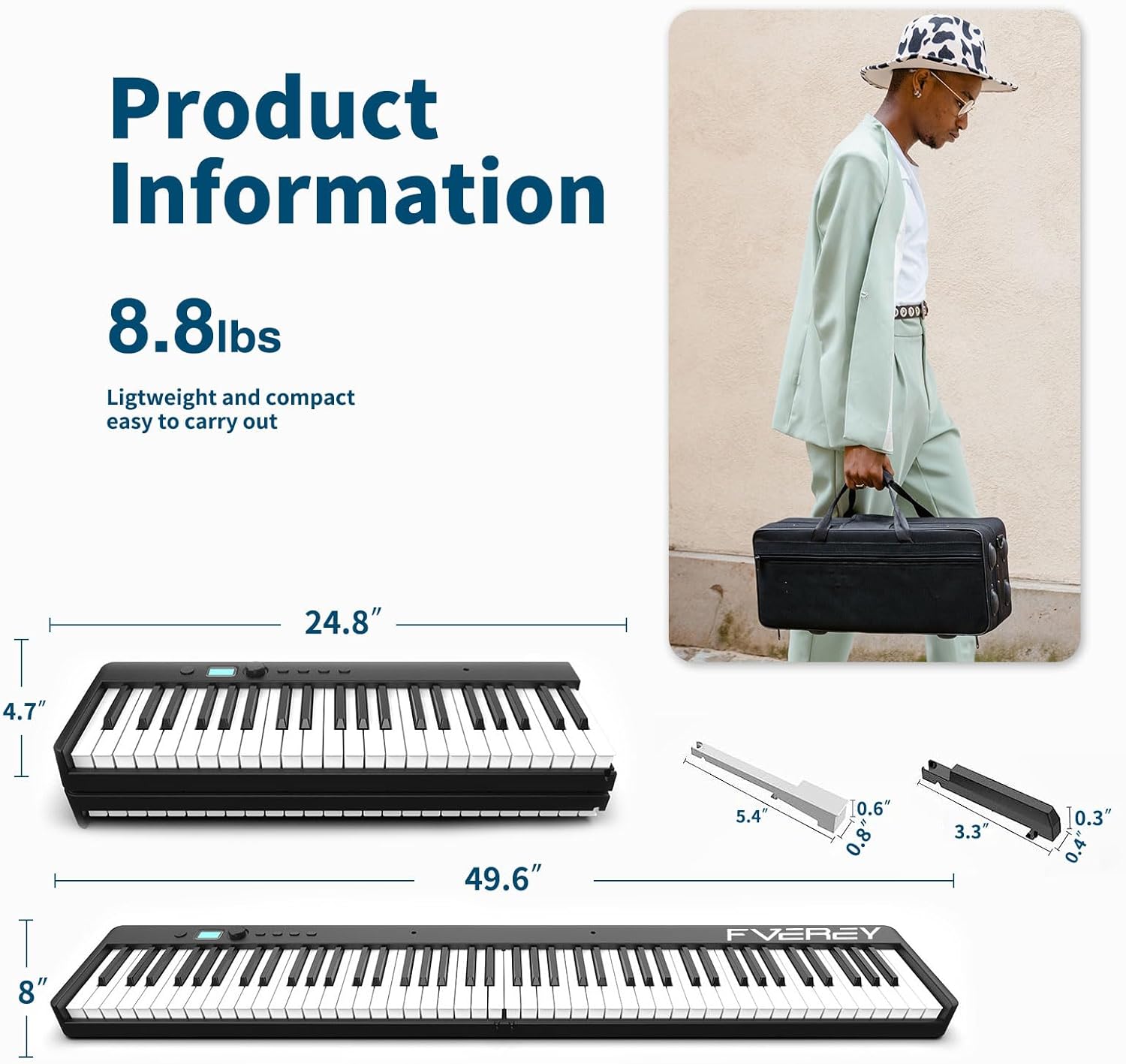 - 🎵【Ultra Portable Folding Piano】 Creative foldable portable design which can be folded in half, only weighs 8.8lb and measures 24.8inch in after folding. This electronic musical keyboard come with piano handbag, it is easier to carry and to transport, you can enjoy playing anywhere anytime, even if you just put it on the home, it doesn’t take up too much space.